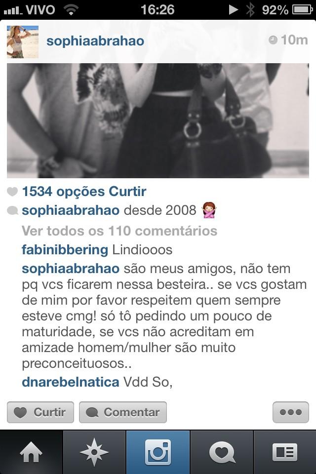 Depois do término de um dos casais mais amados do Brasil: SoMic (Sophia e Micael) as coisas não andam muito boas. Agora que a Sophia está solteira, a gata anda saindo bastante com os amigos, em festas entre si ou em eventos mais sofisticados, a questão é que alguns fãs não estão a respeitando muito, falam que ela já está de namorado novo e muito mais coisas. E pelo jeito a Sophia não está gostando nada disso, tanto que postou um comentário para os Fãs os alertando. Confira no print abaixo: